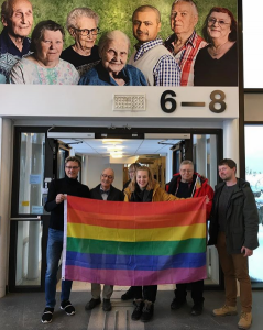 Setan seniorityön työntekijät, sateenkaariseniorit ja pari seniorien asuinpalveluita järjestäviä työntekijöitä tutustuivat maaliskuussa Tukholmassa sijaitsevaan Regnbågen-yhteisötaloon, jossa asuu sukupuoli- ja seksuaalivähemmistöihin kuuluvia ikäihmisiä.