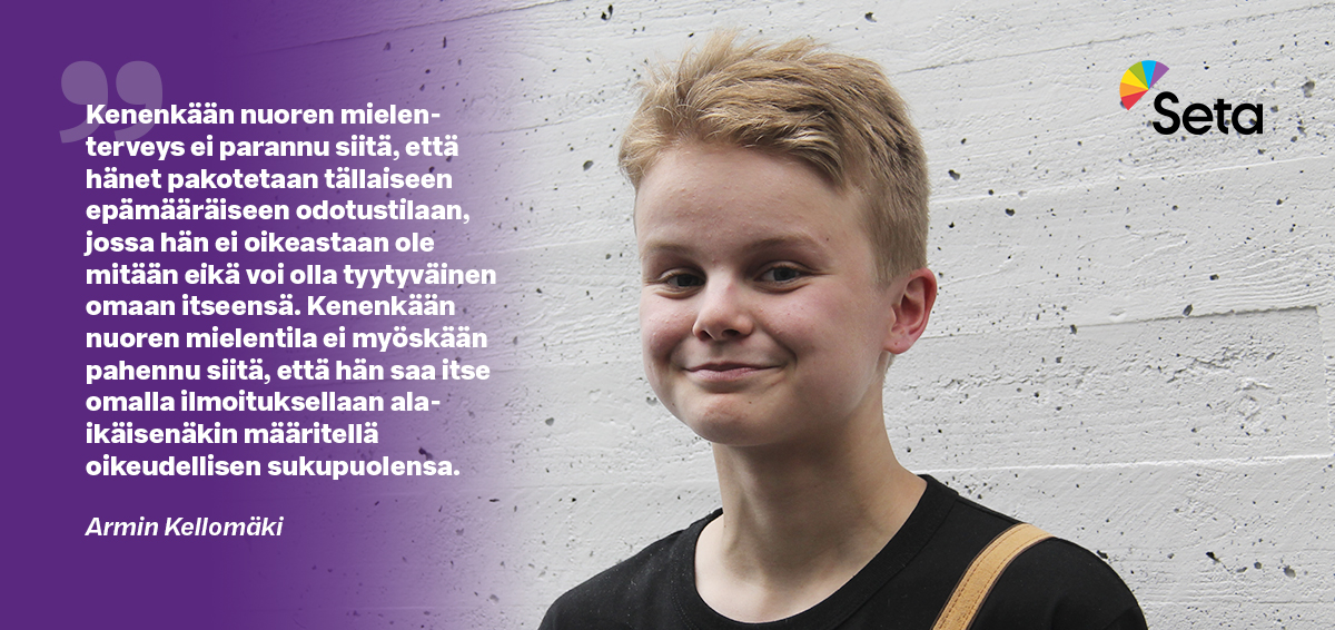 17-vuotias Armin Kellomäki puhui eduskunnan Kansalaisinfossa 20.11. Amnestyn Suomen osaston, Setan ja eduskunnan hlbti-verkoston tilaisuudessa, jossa luovutettiin vetoomus translain kokonaisuudistuksen puolesta eduskunta- ja pienpuolueille.
