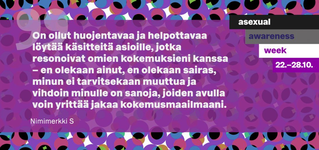 Tällä viikolla on vietetty aseksuaalisuuden viikkoa, jolloin tehdään näkyväksi aseksuaalisuuteen liittyviä näkökulmia ja aseksuaalien omaa ääntä.
