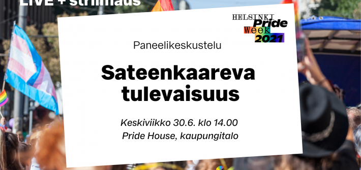Setan sukupuolen moninaisuus -toimikunta järjestää paneelikeskustelun otsikolla Sateenkaareva tulevaisuus. Juhlavuoden kunniaksi käännämme katseen historiasta ja nykyisyydestä tulevaan pohtiaksemme, mitä suuntia vielä toivoisimme esimerkiksi transnuorten ja ei-binääristen tasa-arvolle.