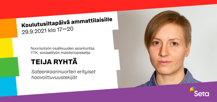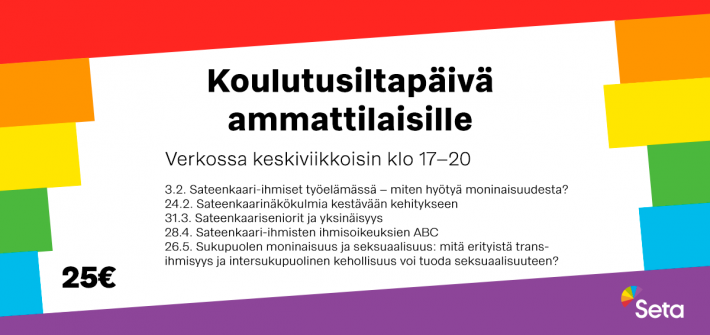 Seta kouluttaa eri alojen ammattilaisia kuukausittaisissa koulutusiltapäivissä, jotka käsittelevät keväällä 2021 sateenkaarinäkökulmasta työelämää, kestävää kehitystä, seniorien yksinäisyyttä, ihmisoikeuksia ja seksuaalisuutta.