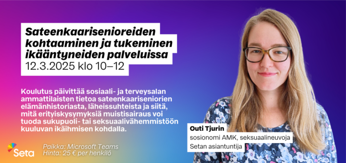 Koulutusiltapäivä Sateenkaarisenioreiden kohtaaminen ja tukeminen ikääntyneiden palveluissa järjestetään etänä Teamsissa 12.3.2026 klo 10-12.
