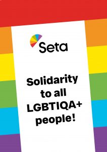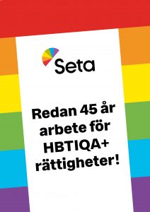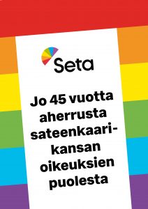 Tule marssimaan Helsinki Pride -kulkueeseen ihmisoikeuksien puolesta valtakunnallisen Setan ja Sukupuolen moninaisuuden osaamiskeskuksen kanssa! Marssimme heti Setan seniorirekan jälkeen ja nostamme esiin 45-vuotisen työmme kaikkien sateenkaari-ihmisten ihmisoikeuksien ja hyvinvoinnin puolesta napakoin huudatuksin, kyltein, lipuin ja banderollein.