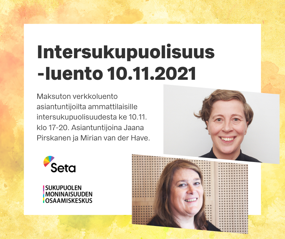 Verkkoluento intersukupuolisuudesta keskiviikkona 10.11. klo 17–20. Asiantuntijoina verkkoluennolla toimivat Jaana Pirskanen ja Miriam van der Have. |