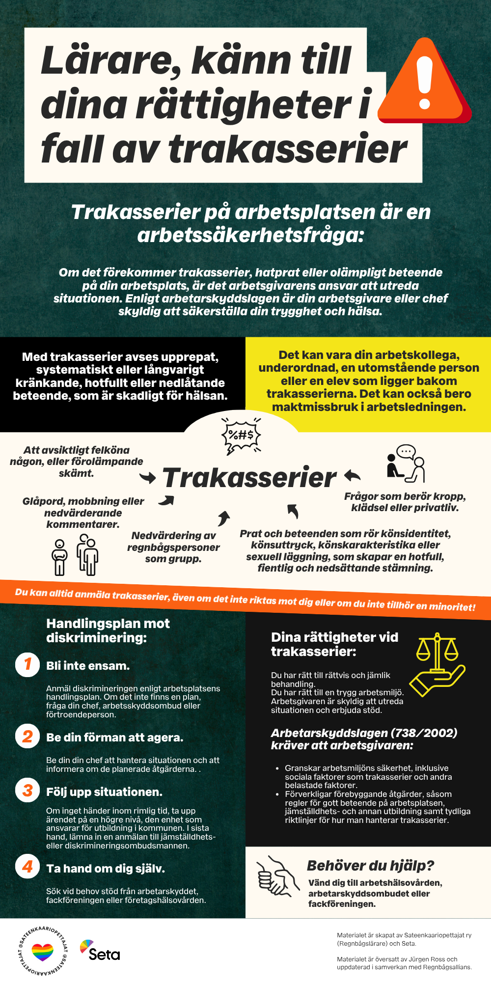 Materialet är skapat av Sateenkaariopettajat ry (Regnbågslärare) och Seta. Materialet är översatt av Jürgen Ross och uppdaterad i samverkan med Regnbågsallians.